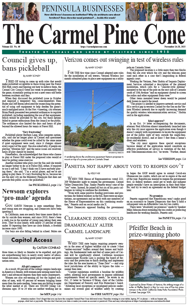 November 14 — FOR THE first time since Carmel adopted new rules for the installation of cell towers, Verizon Wireless last month submitted plans to place new equipment on a utility pole on Carmelo Street. The proposed location is a little more than two blocks ... Read More