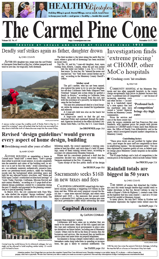 November 21 — AFTER HIS daughter was swept into the surf Friday at Garrapata State Beach in Big Sur, a father jumped in and tried to save her, but tragically, both drowned. The fatal incident is the latest along the north Big Sur coast, where a grim toll of drownings ... Read More