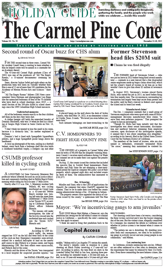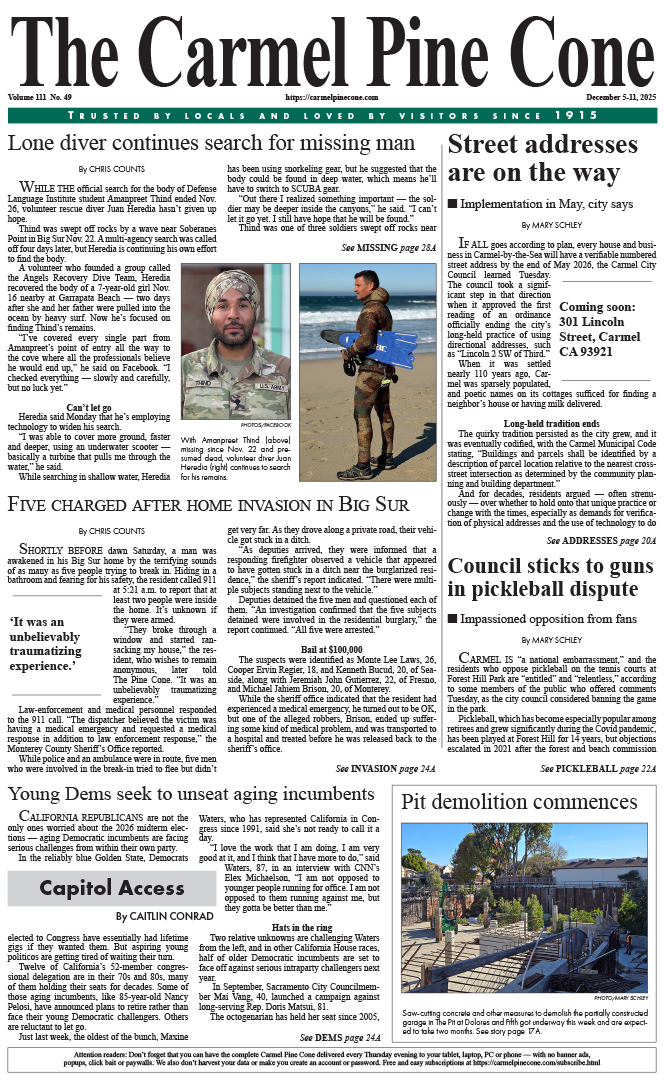 Use this page to download back issues of The Pine Cone in a convenient format (pdf) which allows searching for text, zooming and offline storage. To support The Pine Cone, please subscribe to our email edition by clicking here.