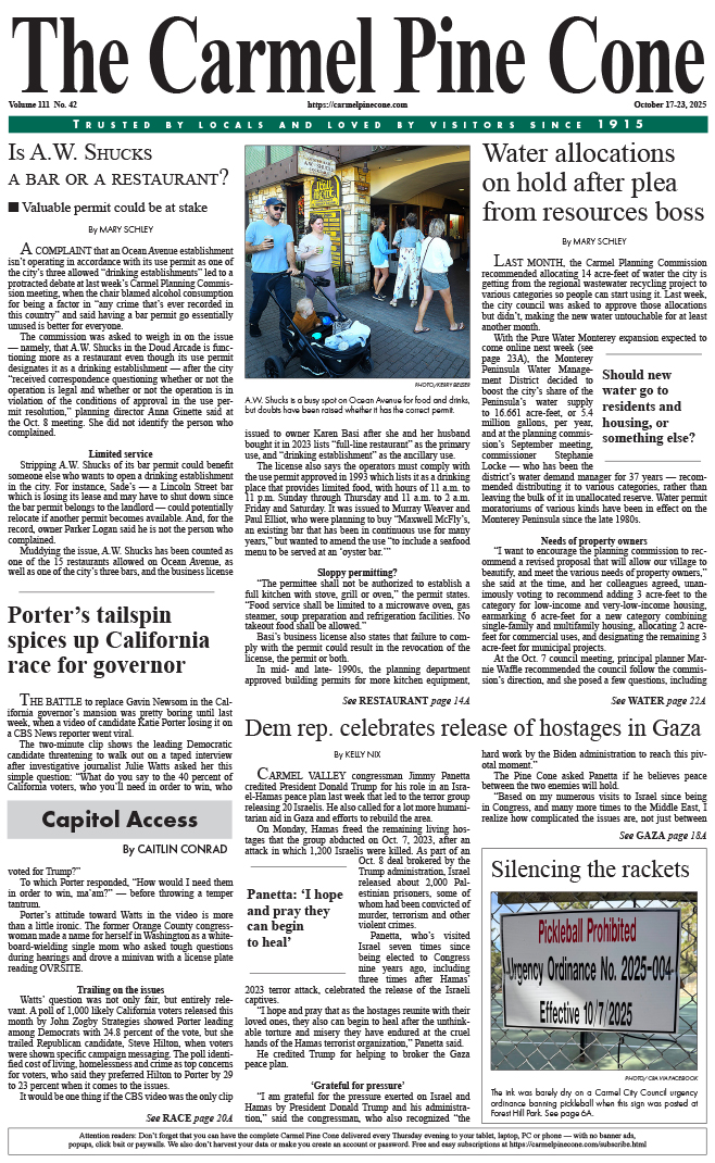 October 17 — LAST MONTH, the Carmel Planning Commission recommended allocating 14 acre-feet of water the city is getting from the regional wastewater recycling project to various categories so people can start using it. Last week, the city council was asked to approve those allocations but didn’t, making the new water untouchable for at least another month ... Read More