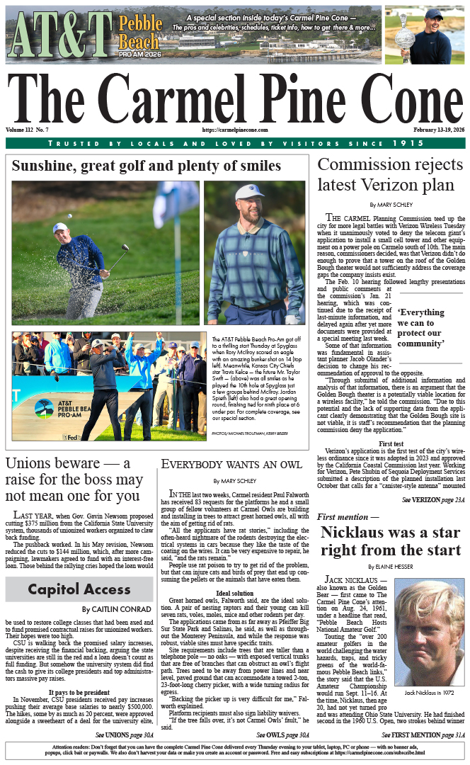 February 5 — OVER THE objections of hotel owners who feel they already pay more than their share of taxes, the Carmel City Council voted 4-1 Tuesday in favor of asking voters to approve a 2-percentage-point increase in the transient occupancy tax rate to raise it to 12 percent. The tax was last increased in 1998 ... Read More