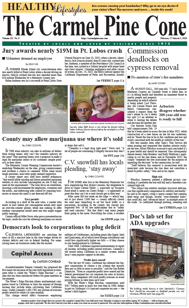 February 27 — A 60-FOOT-TALL, 200-year-old, 77-inch-diameter Monterey Cypress on Carmelo Street is either fine, or it’s in failing health and therefore an imminent threat to nearby people and property, depending on which arborist is being asked. Last Thursday, the Carmel Forest and Beach Commission considered a request from the tree’s owner to cut it down ... Read More