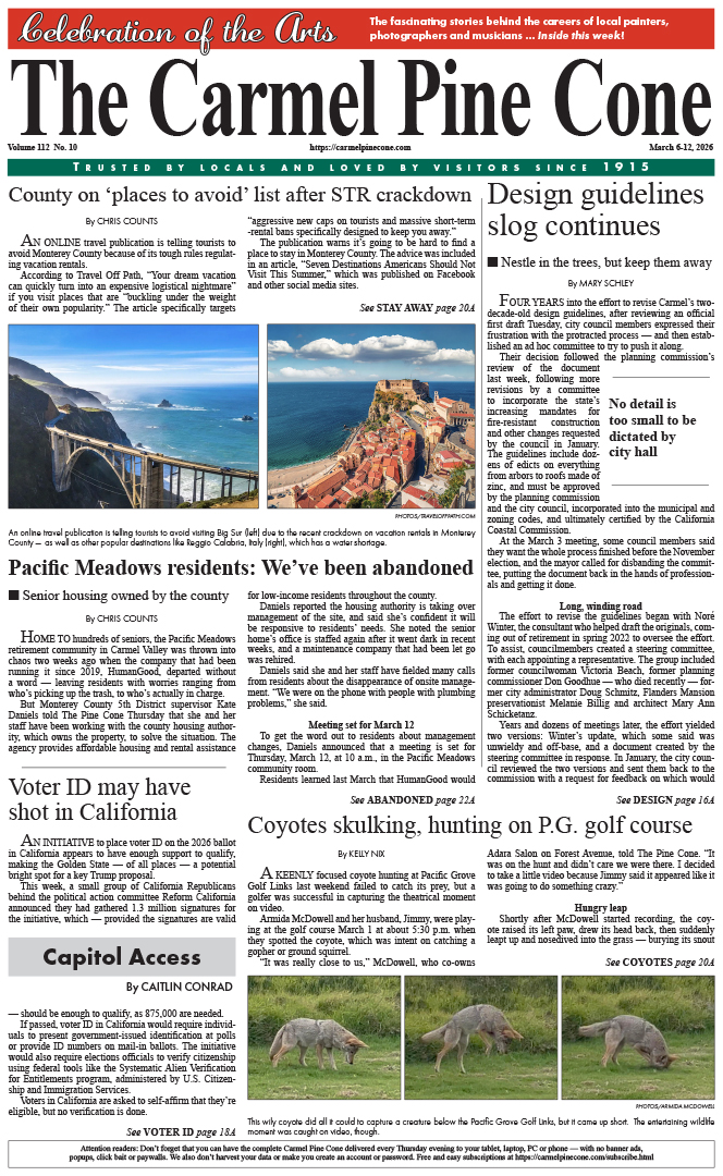 March 5 — AN ONLINE travel publication is telling tourists to avoid Monterey County because of its tough rules regulating vacation rentals. According to Travel Off Path, “Your dream vacation can quickly turn into an expensive logistical nightmare” ... Read More